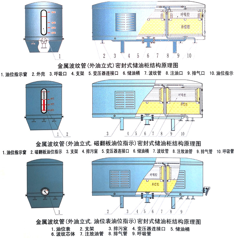 金屬波紋管(外油立式)密封式儲油柜,是我公司根據多年來用戶使用波紋儲油柜的意見和建議,研制生產的新一代儲油柜。它使用的是圓柱形波紋管芯體,實現變壓器油隨溫度變化的容積補償和油質保護。圓柱形波紋管,受力均勻,承壓能力強,不易失穩(wěn)變形。加工工藝簡單,更容易保證產品質量。該產品克服了外油臥式儲油柜運行時因受變壓器油重力影響受力不均,失穩(wěn)變形、出現卡滯、增大運行壓力等現象。和內油式儲油柜比較,波紋芯體受儲油桶保護,運行更安全可靠。該產品油位指示采用窗式指示、磁翻板油位指示、傳統(tǒng)油位表油位指示。指示刻度直接標出,準確、直觀、便于觀察,同時改變了多年來用“油位-油溫曲線板”的習慣。各種油位指示均設有高低油位報警裝置,可根據用戶需要輸出4~ 20mA模擬信號。金屬波紋管外油立式儲油柜性能指標先進,技術成熟可靠,造型美觀大方,是儲油柜的換代產品。