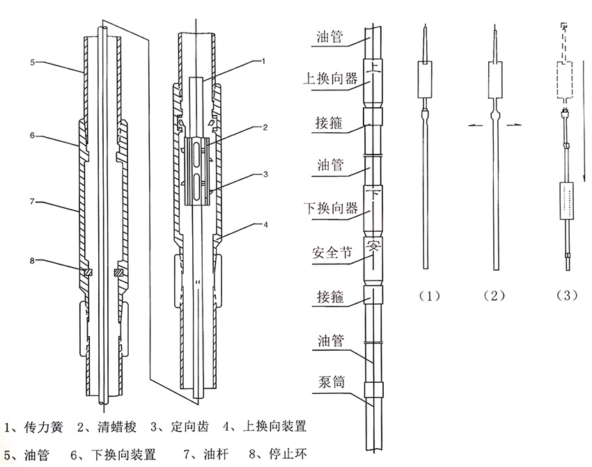 下控制部分,一般自然連接在最低結(jié)蠟層以下200米左右的油管上。它的功能是阻止泵桿上的清蠟梭由此再往下行,當(dāng)清蠟梭停止在下控制體內(nèi)的時候,還能使清蠟梭倒換行進(jìn)方向,向上行走,這樣往復(fù)循環(huán)達(dá)到清蠟梭連續(xù)工作的目的。